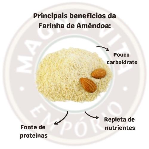 A Farinha de Amêndoa tem como benefício auxiliar no emagrecimento, ela também promove a sensação de saciedade, pois é rica em fibras, proteínas e gorduras não saturadas que fazem parte de sua composição. É uma opção de farinha com pouco carboidrato e baixo índice glicêmico, ideal para manter o peso.