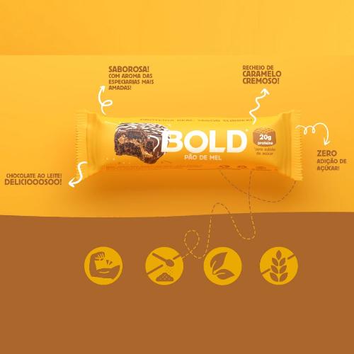 A Barra Bold Bar Pão de Mel 60g possui 216 kcal, 32g de carboidratos que têm função energética e estrutural e 20g de proteínas, as proteínas servem para ajudar a produzir massa muscular e manter a pele e cabelos saudáveis entre outros benefícios.