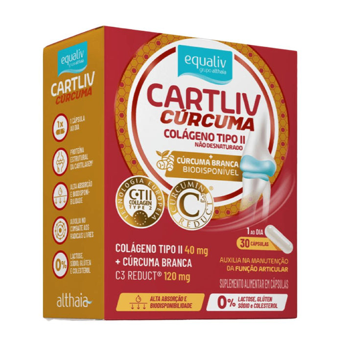 O Cartliv Curcuma 30 capsulas Equaliv é um suplemento inovador que combina colágeno tipo II, a principal proteína presente na cartilagem, com Curcumin C3 Reduct, um extrato biodisponível de cúrcuma branca. Desenvolvido com tecnologia importada da Europa, esse suplemento é especialmente formulado para auxiliar na saúde das articulações, promovendo mais mobilidade e conforto. É indicado para proteger as articulações, ajudando na regeneração da cartilagem e na redução de processos inflamatórios. Seu uso é recomendado para pessoas que desejam manter a saúde articular, como atletas, idosos ou qualquer pessoa que sofra com desgaste nas articulações.