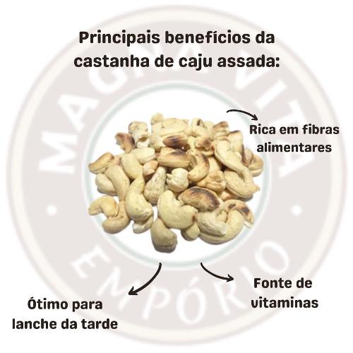 A castanha de caju assada pode oferecer benefícios como: melhora na saúde do coração e dos ossos, ajuda a reduzir o colesterol ruim e aumenta o colesterol bom, melhora do sistema imunológico, e as funções neuromusculares ajudando no aumento de energia.