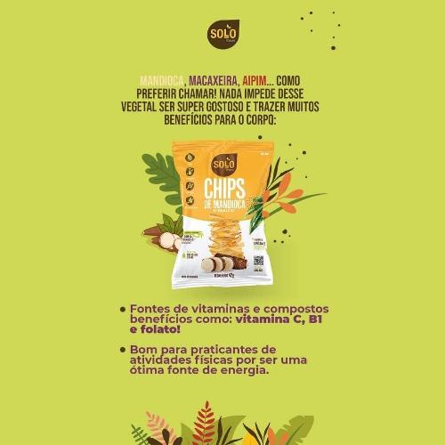 O Chips de Mandioca e 42g Solo Snacks, é muito sequinho, fininho, crocante e delicioso. Ele é levemente temperado com sal do himaláia e é feito no óleo de coco e palma que são óleos mais saudáveis. Esse chips também tem a vantagem de ser vegano, sem Glúten, sem lactose e sem gordura trans. Tornando esse chips uma ótima opção de lanchinho entre suas refeições.