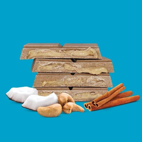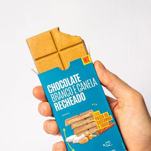 Pensando nisso, a We Nutz fez um chocolate totalmente vegano, à base de plantas, sem conservantes, sem lactose e sem adição de açúcar refinado e que consegue ser tão saboroso quanto o tradicional sendo uma versão saudável e natural. Nessa versão a WeNutz criou uma combinação do chocolate branco sem açúcar com a canela que traz um perfume delicioso. Para o recheio, mantivemos a filosofia do "menos é mais" e com apenas 5 ingredientes criamos uma obra prima. Recheado de pasta de castanha de caju super cremosa, com pedaços de coco e um toque de sal do Himalaia pra dar um up no sabor.