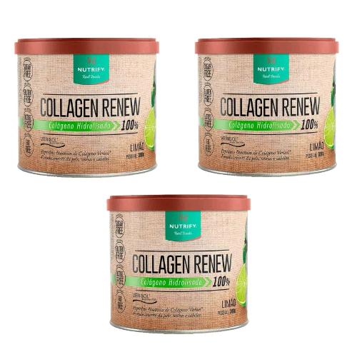 O Kit 3 Collagen Renew Limão 300g Nutrify no sabor cítrico de limão, este suplemento alimentar é responsável por diversos benefícios ao nosso corpo, desenvolvido exclusivamente para auxiliar na manutenção da saúde da pele, realizando o processo de nutrição de dentro pra fora. A cada porção de 10g do Collagen, são fornecidos 2,5g de colágeno hidrolisado Verisol. O Colágeno Hidrolisado possui uma melhor absorção do corpo, ou seja, o resultado é ainda mais rápido, numa combinação única de peptídeos bioativos de colágeno.