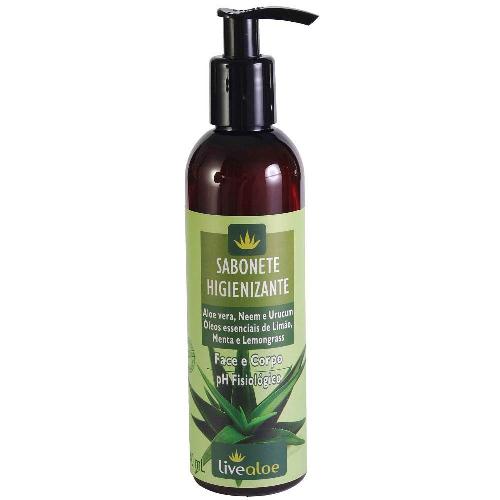 O sabonete higienizante da Live Aloe é totalmente natural, tendo em sua composição 67% ingredientes naturais e 20% orgânicos, com formulação totalmente vegana (sem testes em animais e livre de parabenos, petrolatos e triclosan). Foi feito para uma limpeza profunda na pele, estimulando a regeneração celular, removendo fungos, bactérias e micróbios, além de desobstruir os poros. Possui em sua fórmula alto teor de Gel de Aloe Vera Orgânico, sendo um reparador proteico e cicatrizante. É indicado para todos os tipos de peles.