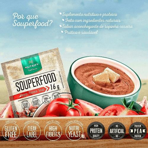 Souperfood é uma sopa proteica que une alta densidade nutritiva, sua composição, conta com o Nutri Yeast, uma levedura nutricional, essa levedura é composta por fibras, proteínas, diversas vitaminas, minerais e antioxidantes. Além de ser rica em fibras, e auxilia na melhora da digestão, na sua fórmula também está presente a polidextrose que é uma fibra solúvel que tem a capacidade de formar um gel ao ser umidificada durante o processo digestivo, promovendo maior saciedade.