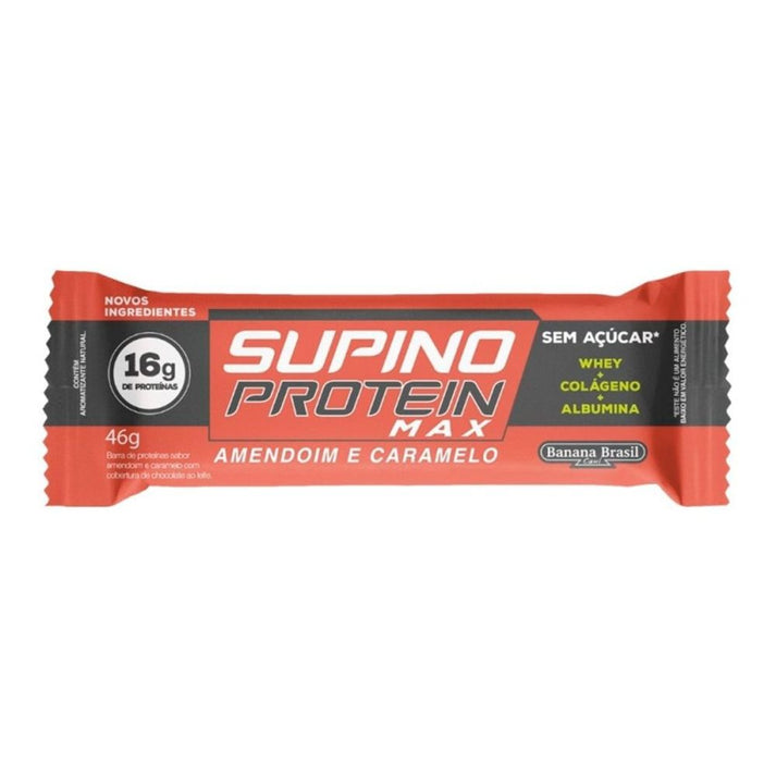 As barrinhas proteicas Supino Protein, da marca Banana Brasil, são essenciais para quem pratica exercícios físicos, quer melhorar a alimentação e procura uma complementação na dieta. Elas contêm albumina, colágeno e whey em sua composição, além de suprir 15% das necessidades diárias de vitaminas e minerais que o corpo precisa. Diferenciais: A Supino Protein Castanha com Caramelo tem um gosto totalmente marcante e único, juntamente com um mix de vitaminas.