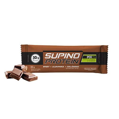 As barrinhas proteicas Supino Protein, da marca Banana Brasil, são essenciais para quem pratica exercícios físicos, quer melhorar a alimentação e procura uma complementação na dieta. Elas contêm albumina, colágeno e whey em sua composição, além de suprir 15% das necessidades diárias de vitaminas e minerais que o corpo precisa. Diferenciais: A Supino Protein Chocolate tem um gosto totalmente marcante e único, juntamente com um mix de vitaminas.