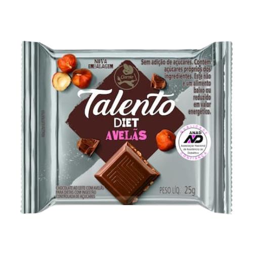 A barra de chocolate Talento Diet Avelã 25g Garoto, é um delicioso aperitivo doce,na versão de avelã, é ideal para pessoas com restrição alimentar, como os diabéticos ou pessoas que optam por não ingerir açúcar, já que este produto possui além da informação de Diet estampado em sua embalagem, ainda vem com o selo de aprovação da ANAD (Associação Nacional de Atenção ao Diabetes). Sem perder o sabor incomparável, os chocolates Talento são referência no quesito qualidade.