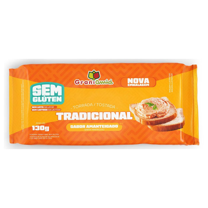 A Torrada Tradicional sem Glúten 130g Grani Amici é um alimento saboroso e saudável, além de ser livre de conservantes, sem glúten e lactose. Uma ótima opção para seus cafés e lanchinhos do dia, a torrada tradicional da Grani amici é crocante e macia, com um leve sabor amanteigado que vai te conquistar.